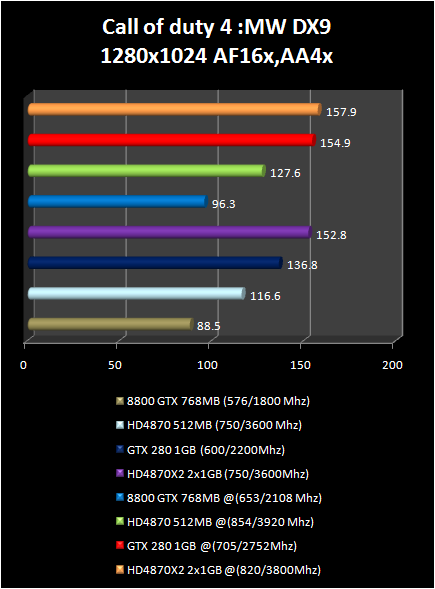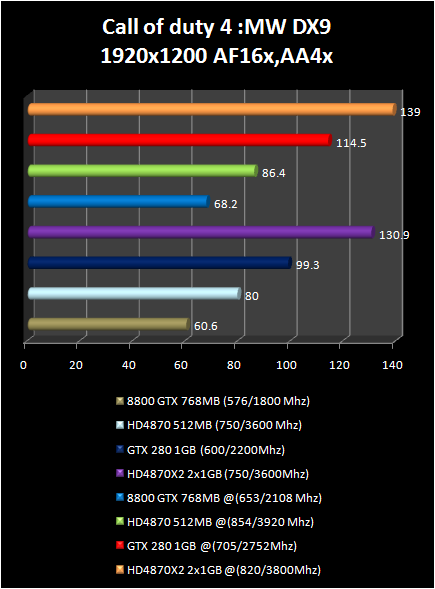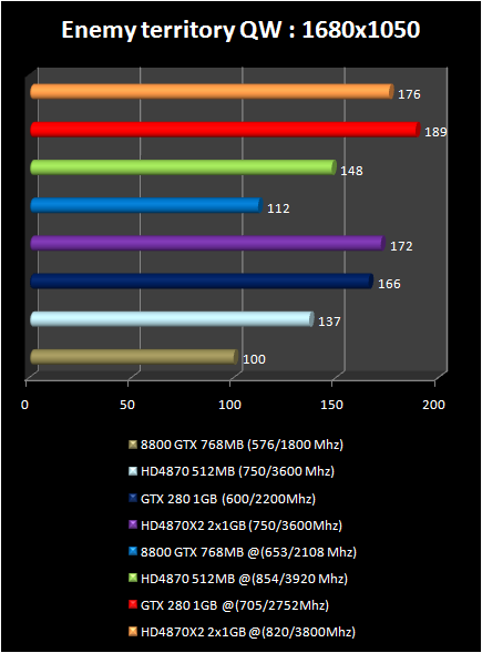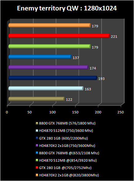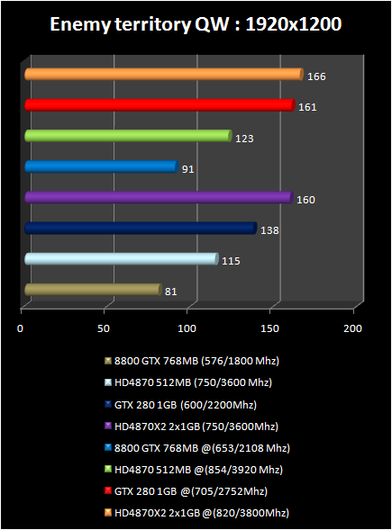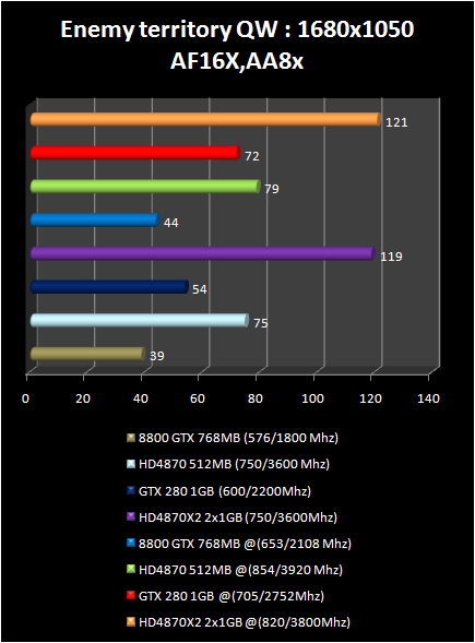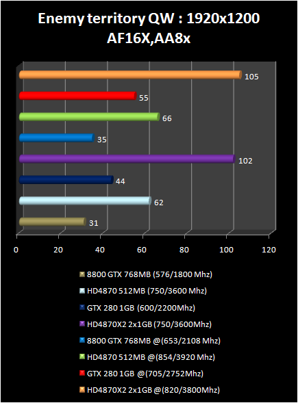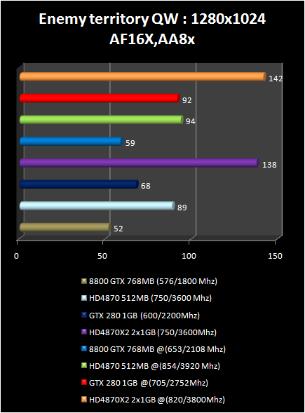 A very interesting results in the game enemy territory: Quake wars. Without AA and AF the GeForce GTX 280 occurs faster than the Radeon HD 4870 X2 (with exception of 1920 X 1200 resultion ). However, with filtration activated , all radically changes. The Radeon HD 4870 X2 wins, moreover by a large margin ! .