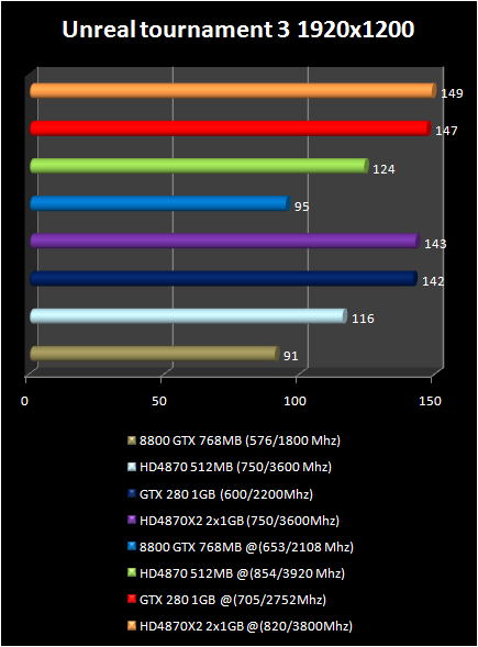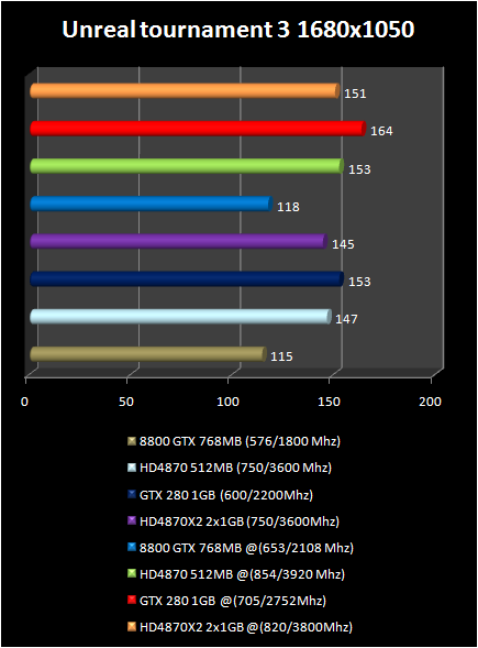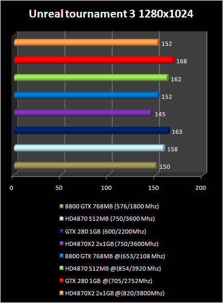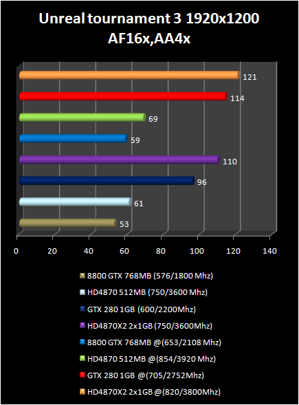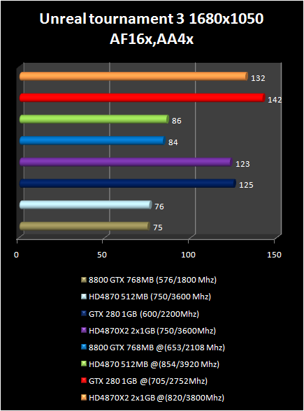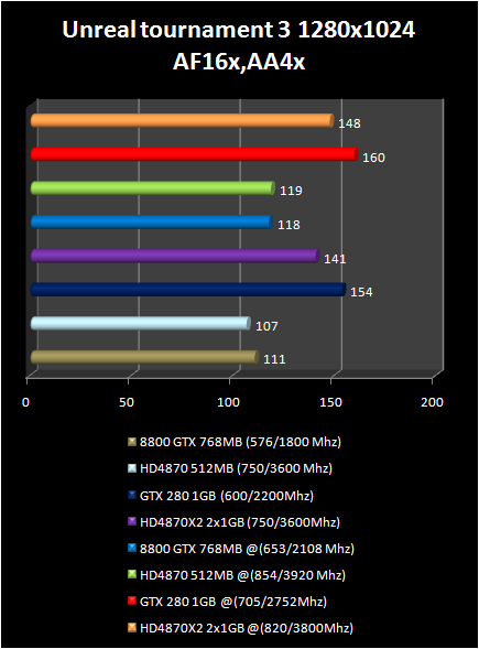 Unreal tournament 3 actually proved to be the only today game , were GeForce GTX 280 demonstrates a advantage over the Radeon HD 4870 X2. But in the heaviest regime, the Radeon HD 4870 X2 back again the lead.