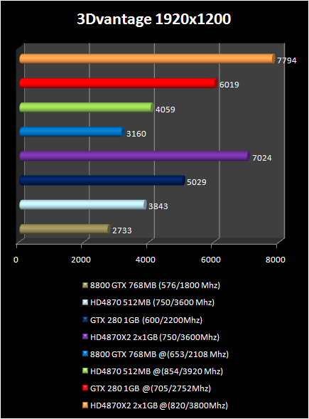 In both synthetic benchmark , video cards were arranged exactly according to the order of their recommanded cost. Hi-End video card from the past generation GeForce 8800 GTX everywhere is inferior to the Radeon HD 4870. Note in the first 3DMark vantage test the Radeon HD 4870 X2 showed some artefacts . Most likely, problem lies in catalyst drivers.