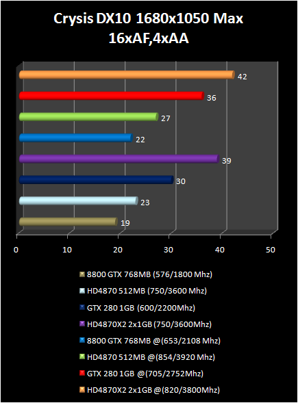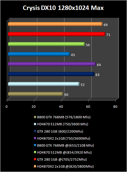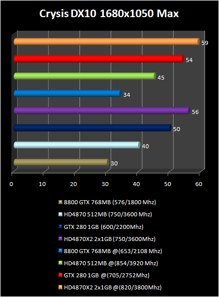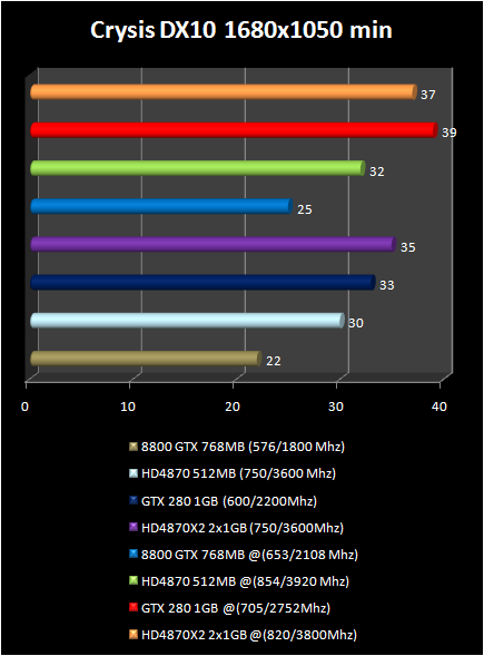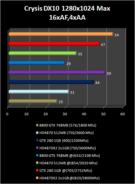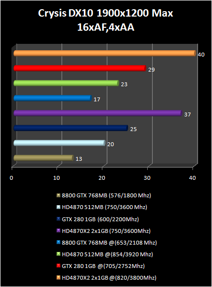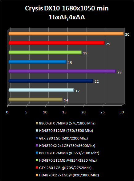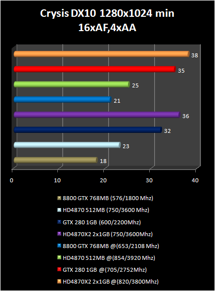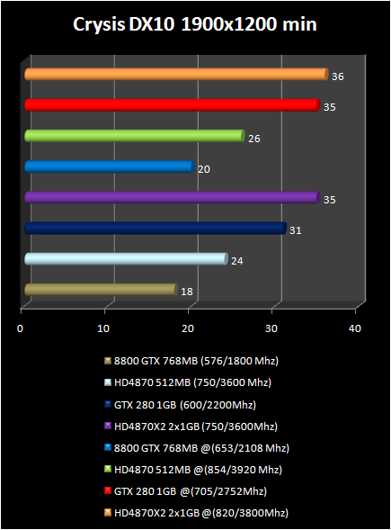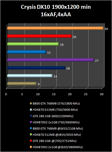 In Crysis the situation changes depending on the video card load , the higher it is, the greater is the advantage Of radeon HD 4870 X2. The single chip Radeon HD 4870 is here noticeably faster than the GeForce 8800 GTX.
