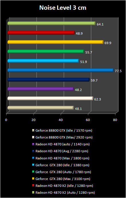 85 degree Celsiuss in the load peak, this, certainly lower than the hottest GPU two-chip card from ATi, but also about 7 degrees higher than the GeForce GTX 280, whose fan is moreover quieter. Now let us increase the fan rotation speed (to 2500 RPM) and tests again: