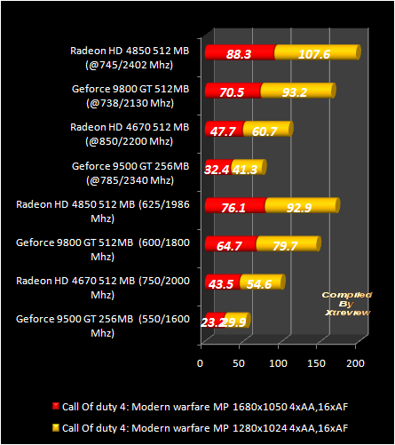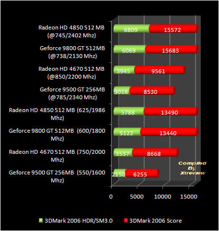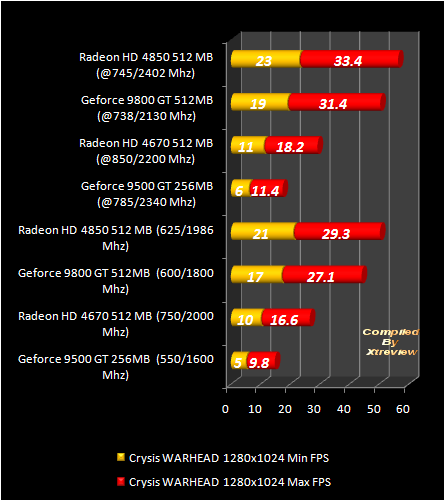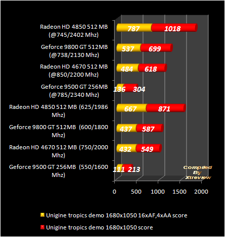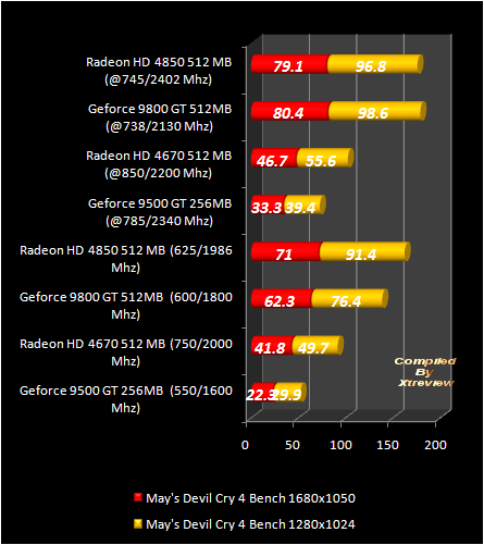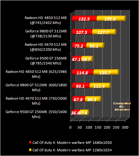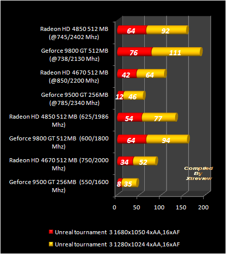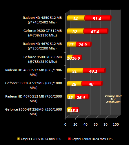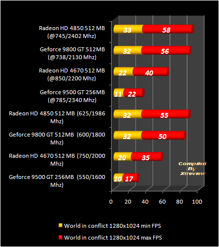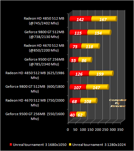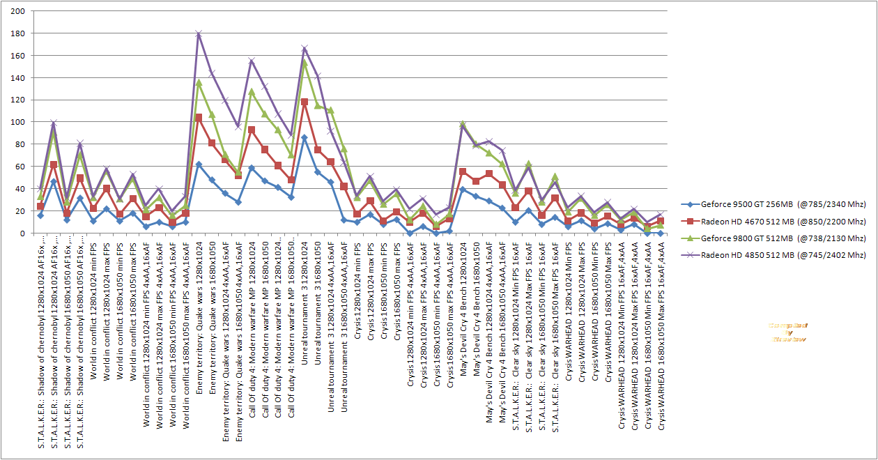 For 40% additional cost with the Radeon HD 4670 (over the GeForce 9500 GT ) user obtain 95% higher performance in the resolution 1280 X 1024 and up to 138 % in resolution 1680 x 1050. Now for 36% additional payment for the GeForce 9800 GT over the radeon HD 4670, user will obtain 45- percent increase in 1280 X 1024 and + 34% in 1680 X 1050. At the same time, the Radeon HD 4850, which cost up to 24% more than the GeForce 9800 GT, user will get 17% boost @ 1280 X 1024 and 23% in 1680 x 1024 ( with the exceptions of S.T.A.L.K.E.R.: Clear sky and unreal tournament 3)