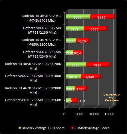 In the newer synthetic 3DMark vantage all video cards were arranged according to their cost. The Most successful overclocking video card ( GeForce 9500 GT ) show a increase of ~30%, but this does not suffice to reach the performance of the radeon HD 4670. In this case the overclocked GeForce 9800 GT on the contrary show a similar performance as the Radeon HD 4850.