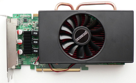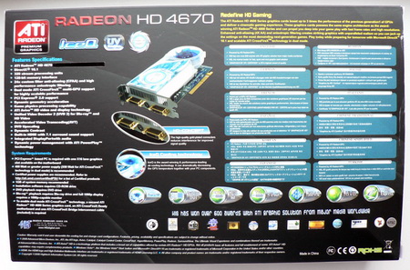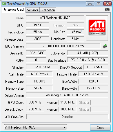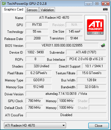 GPU Crystal area composes only 145 sq. mm. with 514 mln. transistors, this chip is released on the 55- NM technical process and saturated by 320 stream processors, 32 textural blocks and 8 blocks Rop\'s. The graphic processor frequency is 780 MHz, 30 MHz higher than the indicated in AMD specifications for the radeon HD 4670 (750 MHz). In the 2d regime the chip frequency is reduced to 168 MHz.