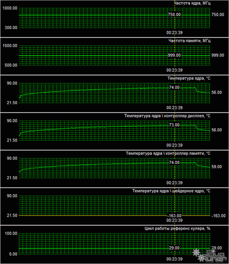 The fan speed is constant and completely quiet . But here the cooler efficiency proved to be on the average level , since at the lowered to standard for Radeon HD 4670 frequencies the graphic processor temperature rapidly reached 74 degree Celsius: