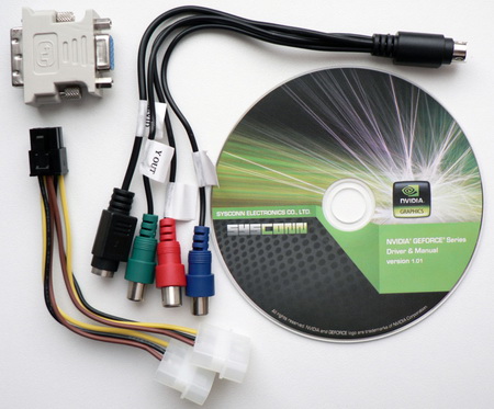 For testing we got the OEM version . Inside the box besides the video card , one adapter 15 pin DVI/D -Sub, S -Video , CD with drivers and adapter for additional video card power :