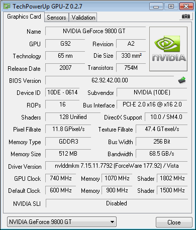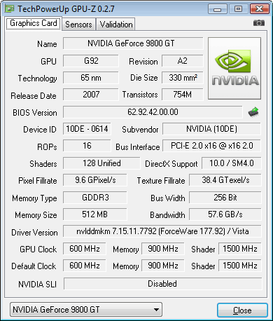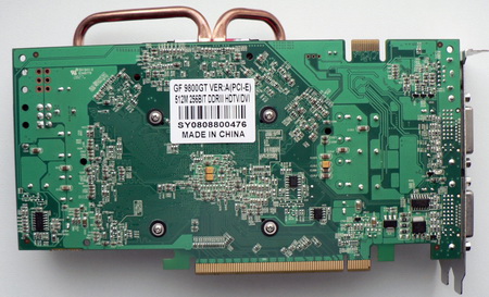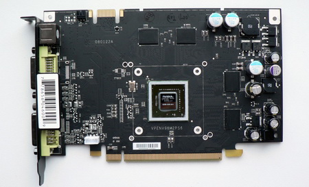 The graphic processor frequency is 600 MHz, and its shader domain is 1500 MHz, which completely corresponds to the GeForce 9800 GT specifications . The GPU configuration include : 112 stream processors, 56 textural blocks and 16 blocks ROP\'s : identical to the GeForce 8800 GT.