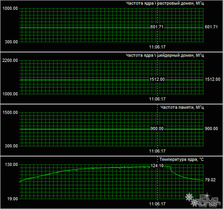 using Accelero S1 we was able to overclock this card to 738 MHz or + 21.3% (Shader domain to 1782 MHz or + 17.9%), and the video memory to 2130 MHz or + 18.3%: