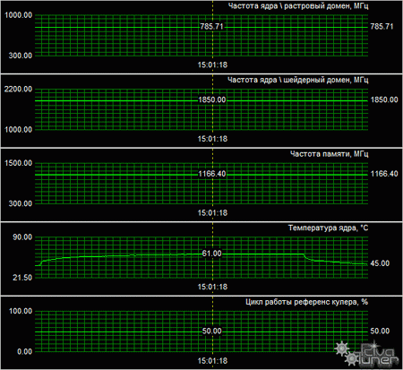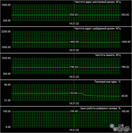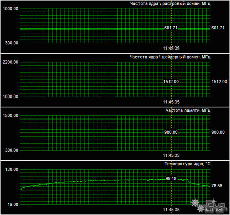 The operating temperature of the overclocked card did not change in the comparison with the default frequencies, peak GPU temperature grew by 2 degree Celsius only.