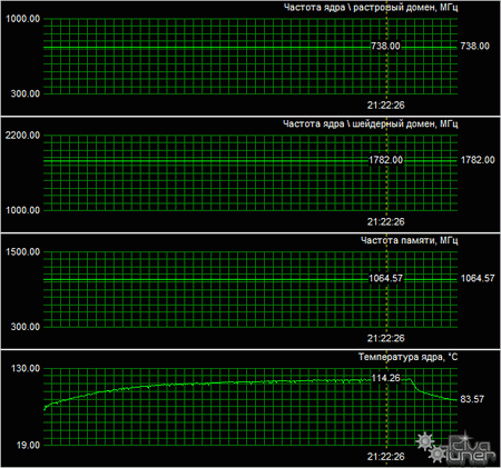 In this case the GPU temperature in the peak load grew to 114 degree Celsius, which according to the previous calculation should be 71c :