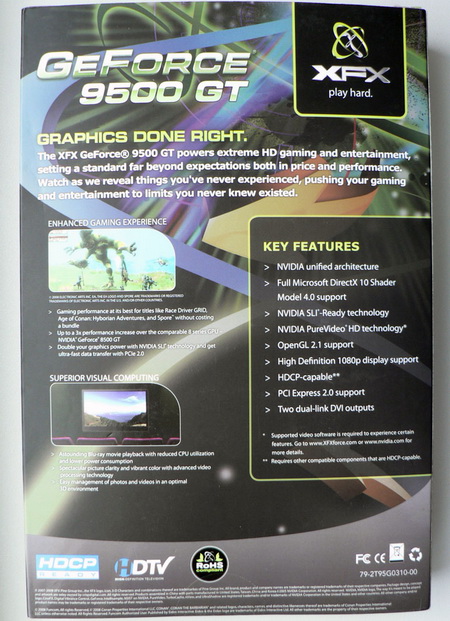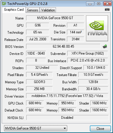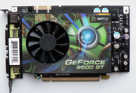 XFX GeForce 9500 GT XXX alpha dog is equipped with PCI-Express x16 version 2.0 , two yellow DVI- I (dual-link) ports with high resolutions support and video out: