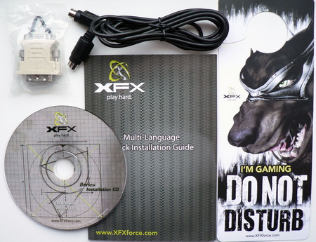 The card come with 15 pin DVI/D -Sub adapter, cable S -Video, CD with drivers, User instruction and the overclocking utility: