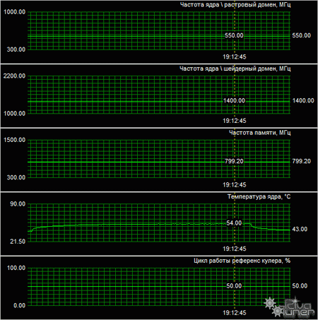 Only 54 degrees in peak load , it is completely typical for video card and their reference cooling systems. increasing the rotation speed reduce the temperature by 2 degree Celsius: