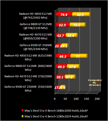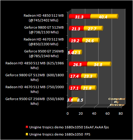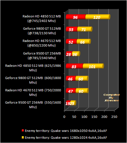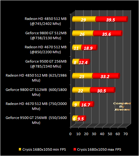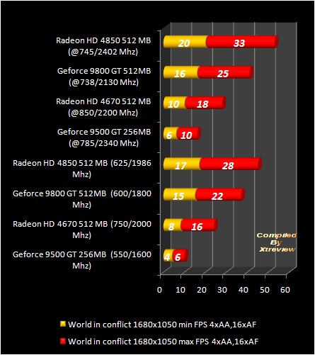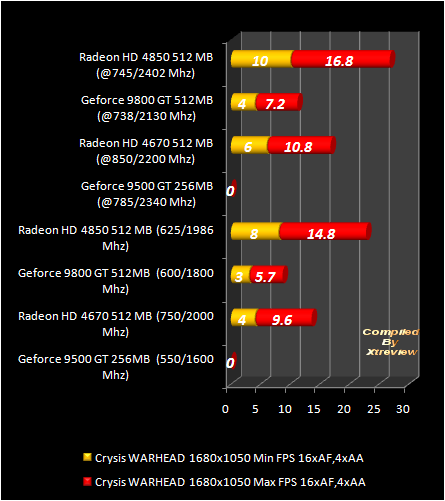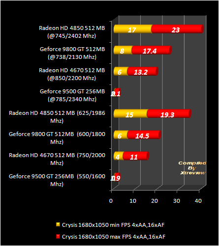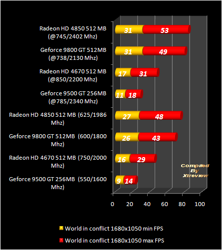 There results from the GeForce 9500 GT are absent due to the slow performance almost 1 FPS no more . The Radeon HD 4670 in the most qualitative regime and 1680 X 1050 resolution is faster than the more expensive GeForce 9800 GT.