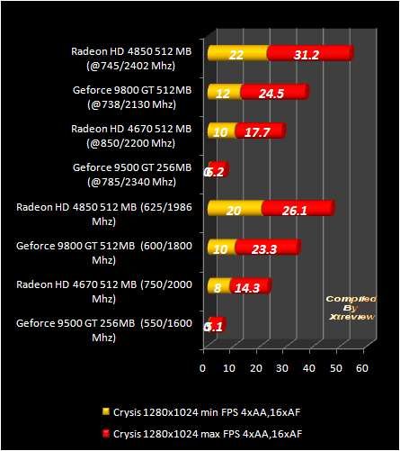 The speed Of the GeForce 9500 GT in Crysis is ultra low, such video card is far from the minimum games requirement . However, other participants are capable of ensuring some comfortable gaming without AA and AF .
