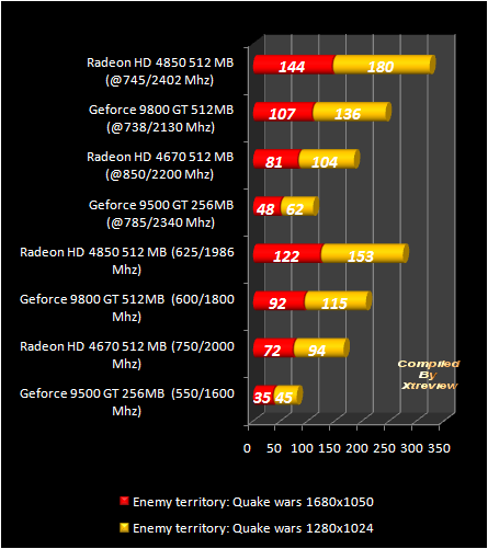 The first surprises. The GeForce 9500 GT is up to four times weaker than the little more expensive Radeon HD 4670, which furthermore almost reach the performance of the GeForce 9800 GT. The radeon HD 4850 is almost 40% faster than the Geforce 9800 GT .