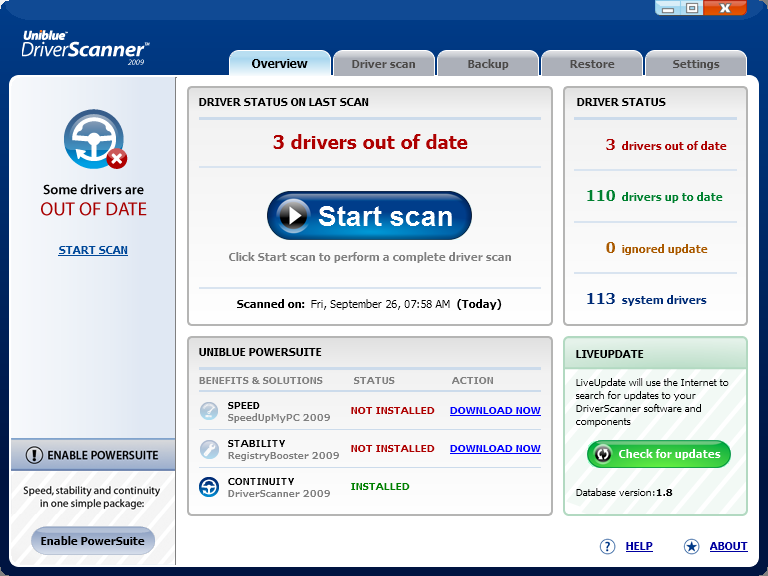 Here is the main window , where the software report about the number of up to date and outdated driver , last scanned time ....