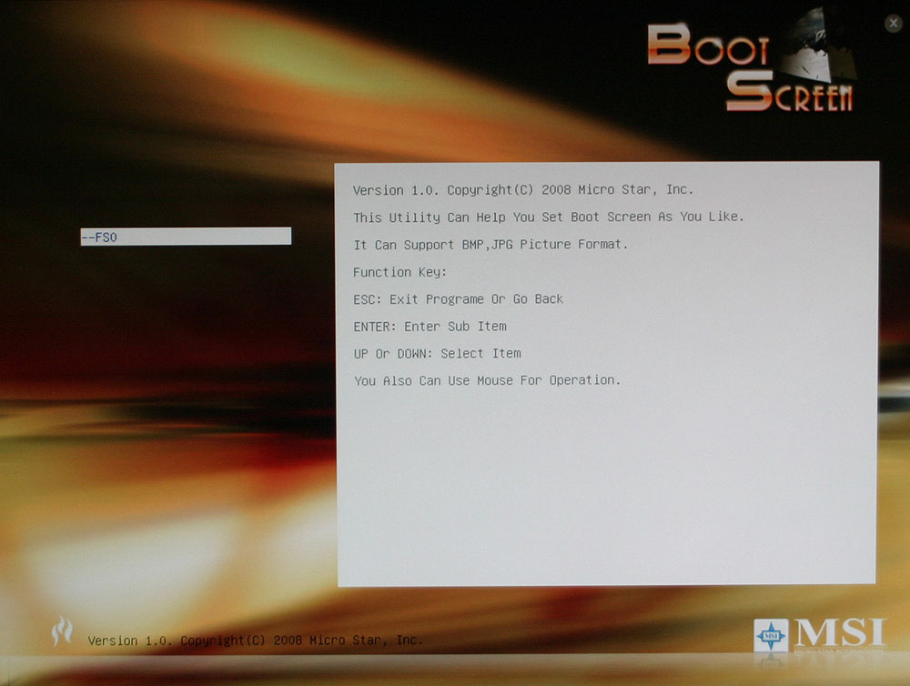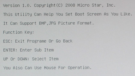 The utility boot screen with the aid of analogous file manager allow user to select picture ( BMP or JPG ) in order to use it as computer boot up logo.