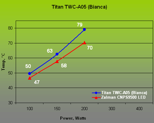 The manufacturer’s promises didn’t come true. The Bianca is in fact noisy and low-performing. Of course, it’s difficult to provide good cooling with a system with such a compact case, but if the developers had equipped it with a quieter fan and a better radiator, it would make a good choice for barebone systems for which a massive air cooler is usually too big. So, we can’t regard the TWC-A05 system from Titan as a good buy notwithstanding its very moderate price of $100