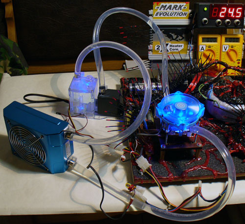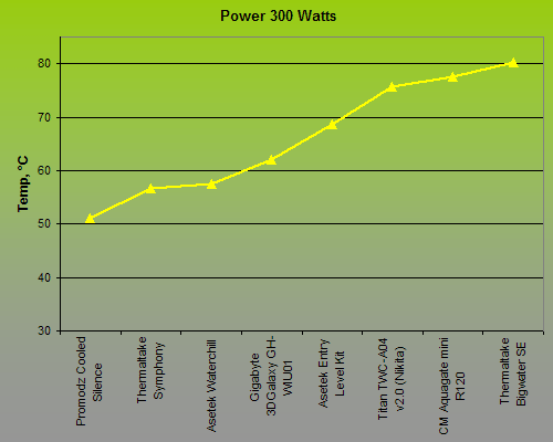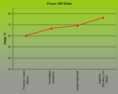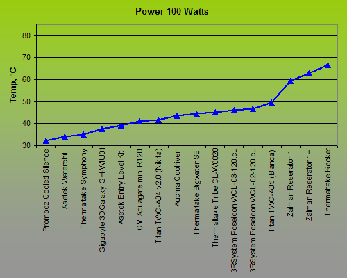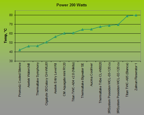 of a real central processor, so it is incorrect to extend the temperature and power showings we get on our testbed to a specific CPU. The thermal sensor is not placed right in the heater’s core, unlike the sensor in a real CPU, so the temperature is going to be somewhat lower. This fact should be kept in mind when you are analyzing the performance measurement results. It also should not be wondered that some of the tested water-cooling kits managed to dissipate 300-400 watts of thermal power on our testbed. This