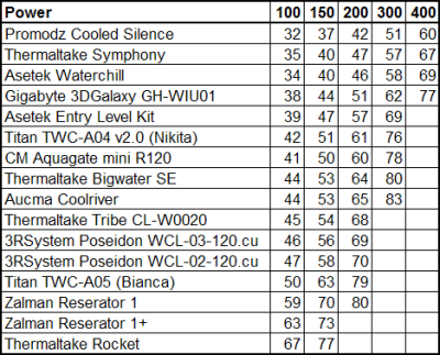 The performance data for all the tested water-cooling systems are presented in the next table for comparison: