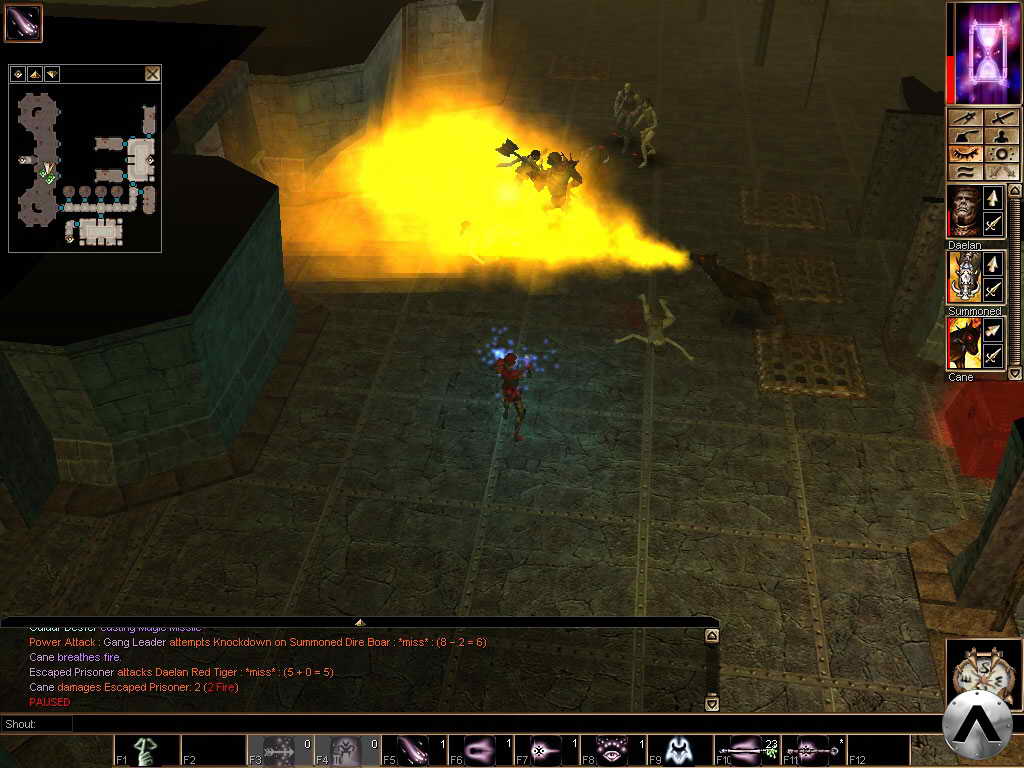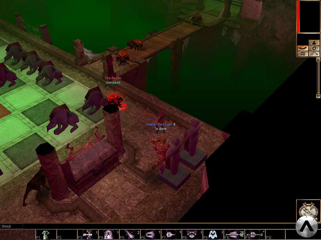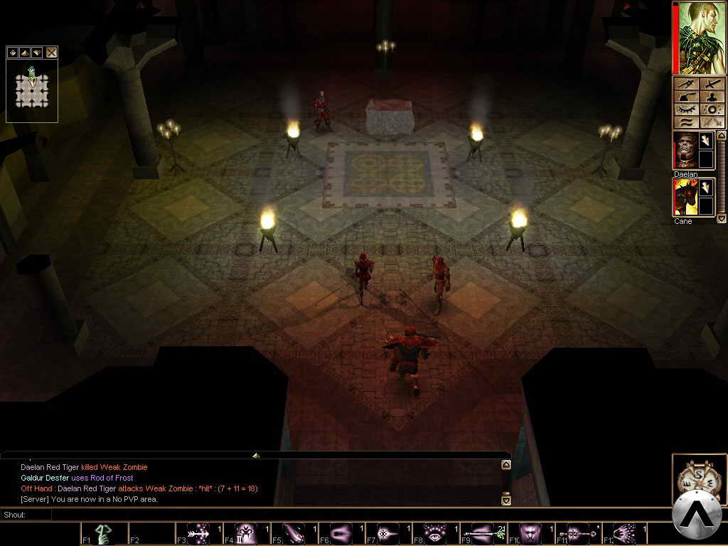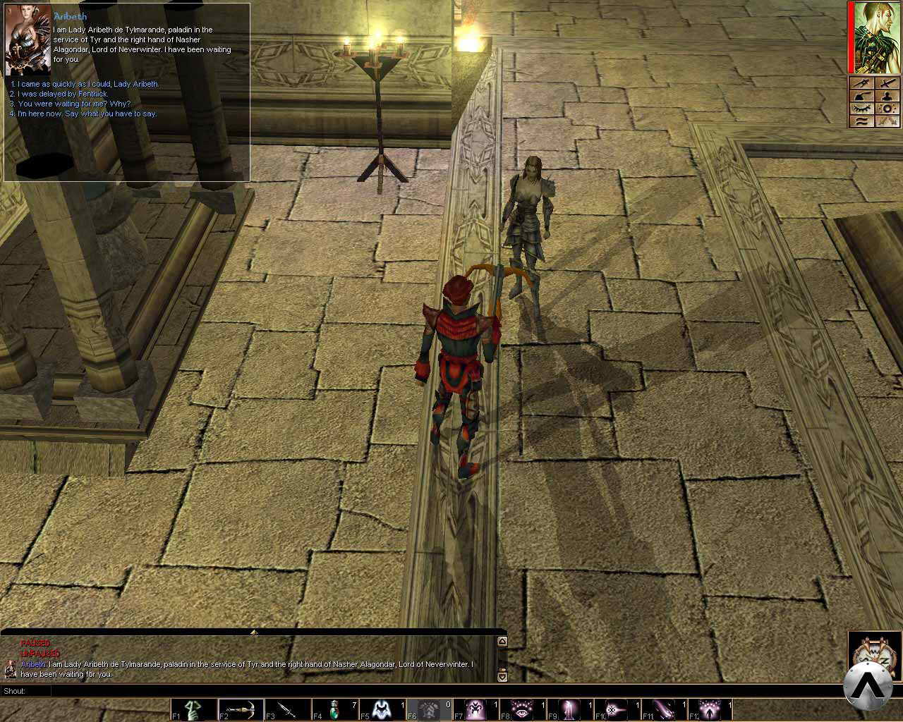 crates and a few chests. Certain rooms that are well decked out are divided up into annoyingly small areas, requiring loads to go from outside to inside, and then from the first floor to the second floor. The tile-based nature of the program favors hard angles and blocky environments. Landscaping is virtually non-existent since the world editor doesn\'t really support robust landscape editing. Usually you\'ll just end up running up and down ramps all set at the same angle. Interface: The basic interface of Neverwinter Nights takes a very utilitarian look, mainly consisting of plain, transparent windows that can be moved and resized to your heart\'s content. There\'s a shortcut key for everything, and commonly used functions can be stored on a bar at the bottom of the screen for instant access through the function keys. Basic interaction through the