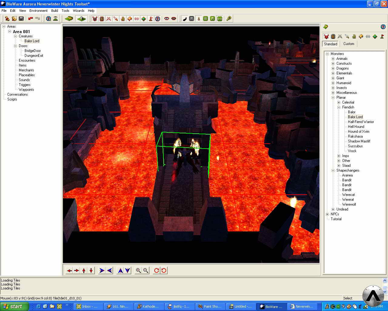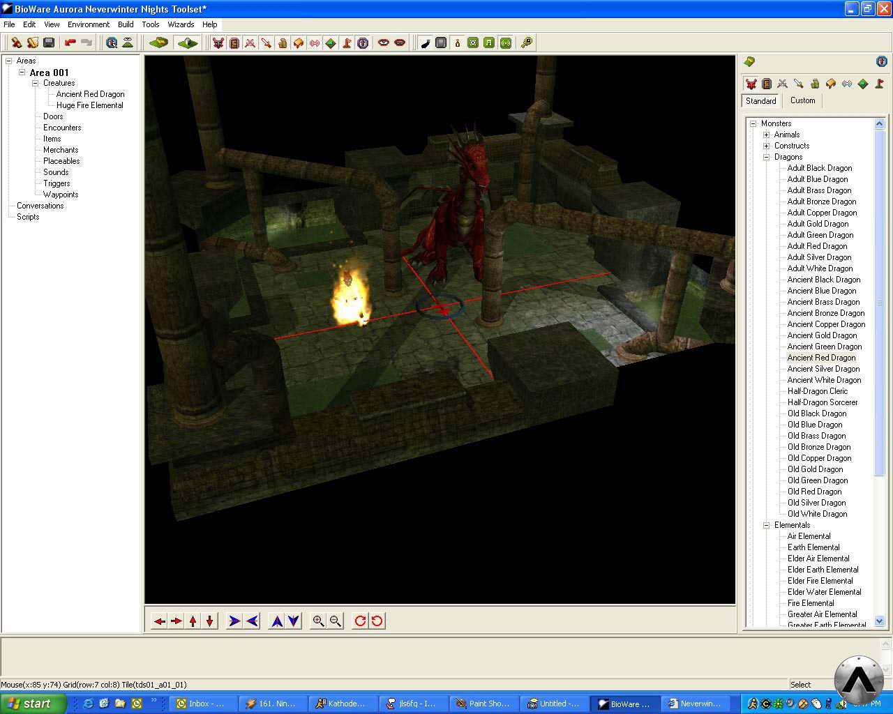 to where you found them. Aside from NPC hirelings, mages can summon familiars as permanent party members (Rangers and Druids can summon animal companions), or other summoned creatures as temporary party members. With the exception of a mage\'s ability to possess his or her familiar, at no time can you control these other party members directly. You are limited to give them simple commands such as "Attack the nearest enemy," "Guard me," or "Stand your ground." The Aurora toolset is the part of the game that has probably received the most hype, and it\'s easy to see why. The tools are the same as the developers used to craft the single-player campaign, and allow anyone willing to put in a little time to craft their own adventures, referred to as "modules." The toolset operates on a tile-based system, making it very simple to create