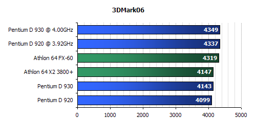 3DMark06 results are very similar to what we have just seen on the previous diagram. At least when it comes to overclocked processors??в„ў performance. As for the results obtained in the nominal mode, Athlon 64 X2 3800+ manages to catch up with Pentium D 930 here. In other words, 3DMark06 puts the youngest AMD Athlon 64 X2 processor in a better position compared to the first Pentium D models from the price-to-performance point of view.