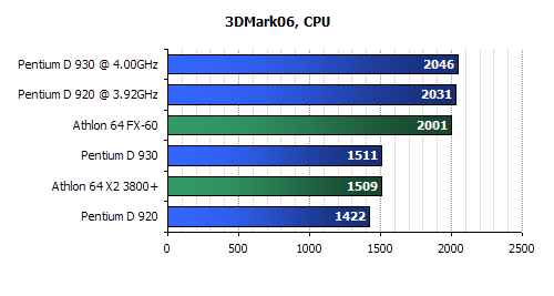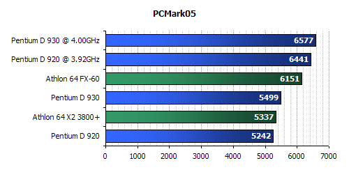 Although PCMark05 is not a very objective test, it is still quite popular. The results we obtain here rank the CPUs according to their price point. The performance of Athlon 64 X2 3800+ appears right between the results obtained on Pentium D 920 and Pentium D 930. However, the performance of Intel??в„ўs overclocked dual-core fellows has an impressive influence on PCMark05 results. Presler based CPUs working at 4.0GHz frequency leave AMD Athlon 64 FX-60 behind in no time.