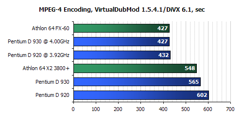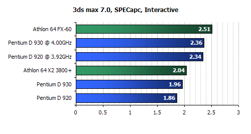The situation in 3ds max can be considered pretty common already. Just as in all other ???heavy??? tasks, Athlon 64 X2 3800+ is faster than Pentium D 920 and Pentium D 930. even the overclocking to 4.0GHz doesn??в„ўt help these processors to defeat Athlon 64 FX-60.