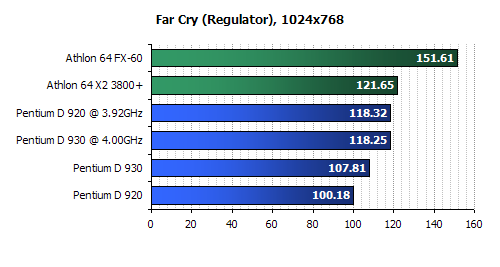 Frankly speaking, we didn??в„ўt even hope that Pentium D processors would win here. K8 architecture proves much more efficient in tasks of this kind than Intel??в„ўs NetBurst. As a result, the youngest Athlon 64 X2 manages to show better performance than even the Pentium D processor overclocked to 4.0GHz (in FarCry, for instance).