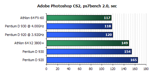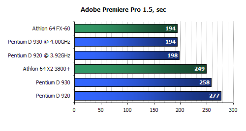 The results in Adobe Photoshop and Adobe Premiere make pretty much the same picture as in the previous case: the results are not in Intel??в„ўs favor. The youngest dual-core AMD processor once again demonstrates better price-to-performance ratio. As for the overclocked Pentium D CPUs, they do show a pretty significant performance boost, but fail to outperform