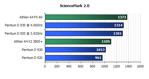 The competitor solutions based on K8 architecture are definitely faster than the rivals in scientific computational tasks. According to ScienceMark 2.0, the performance of Athlon 64 X2 3800+ is higher than that of Pentium D 920 and Pentium D 930. Overclocking also doesn??в„ўt help Intel processors to catch up with Athlon 64 FX-60.