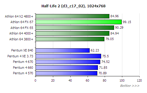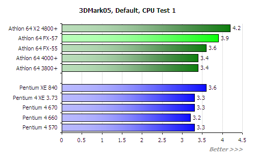 In the CPU tests from the same benchmark the Athlon 64 FX-57 is only inferior to the dual-core processors. This is normal as the CPU load is distributed in two threads here: physics modeling and vertex shader execution.