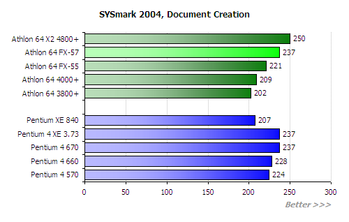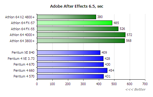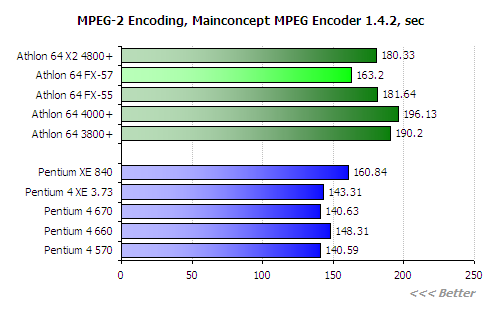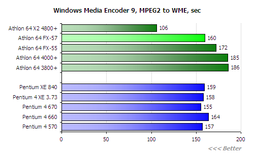 Pentium 4 processors are better optimized for processing streaming media data, though. The Athlon 64 FX-57 with its 2.8GHz frequency and support of SSE3 instructions is anyway slower than the senior Pentium 4 models with such codecs as Lame, Mainconcept, and DivX.