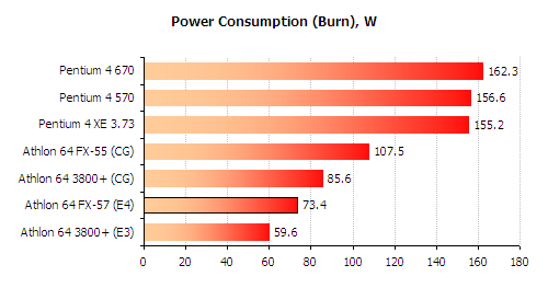 In fact, the power consumption of the new processor is even lower than that of the Athlon 64 FX-55 on the 130nm core. The Athlon 64 FX-57 consumes less than even the senior Athlon 64 models on older, revision CG 130nm cores.