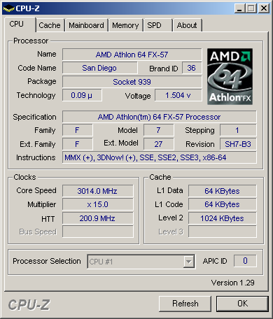 Having got a new processor on the San Diego core into our hands we of course checked its overclockability. We had reached to about 2.9GHz overclocking processors on the Venice core, which is an analog of the San Diego but with the amount of L2 cache memory reduced to 512KB. Athlon 64 FX processors are usually manufactured out of cores with highest overclockability so their frequencies may be higher at overclocking than those of Athlon 64 models. Besides that, being targeted at enthusiastic users, the Athlon