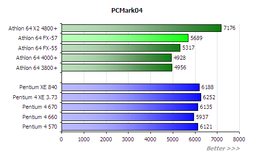 PCMark04 is very sensitive to the number of processor cores, both real and virtual ones. The Athlon 64 and Athlon 64 FX processors are single-core solutions and perform not very well in this test.