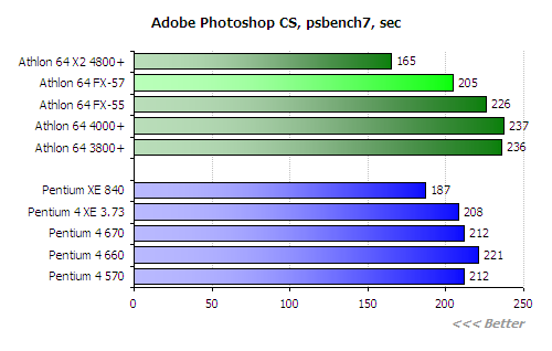 The higher clock rate of the Athlon 64 FX-57 has changed the balance of forces in these Adobe applications. This processor is the fastest single-core CPU in Photoshop and Premier. In Adobe After Effects, however, the K8 architecture is less efficient than NetBurst.