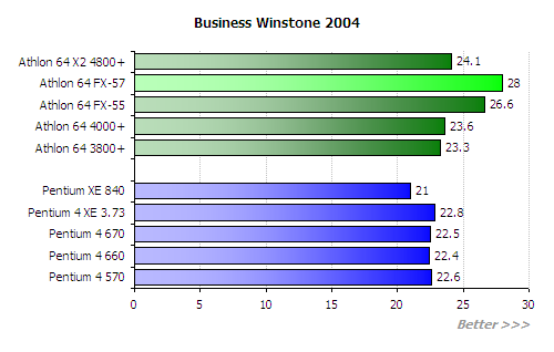 AMD’s processors have traditionally been good in Business Winstone 2004. The Athlon 64 FX-57 improves on their results further, mostly thanks to its higher 2.8GHz clock rate. In SYSmark 2004, however, the new processor is not a leader because this benchmark simulates the user’s working with several applications simultaneously. Pentium 4 processors that support Hyper-Threading technology are better suited to this kind of load.