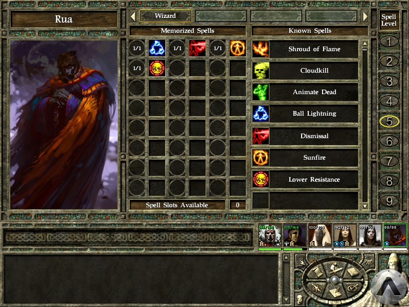 Interface: The interface of IWD2 is near perfect. Residing on the bottom of the screen, the new interface panel is made even more visually impressive by a complete overhaul of the spell and item icons. Beyond this skin-deep change, the removal of the two side panels that used to flank the main view makes managing the party\'s vital statistics much easier while still offering alternative icons for those who prefer not to memorize keyboard shortcuts. Rather than having to hunt down characters in the main view-screen in order to cast a healing spell, a player need only cast it upon a character\'s portrait, all of which are now conveniently located in a single row.