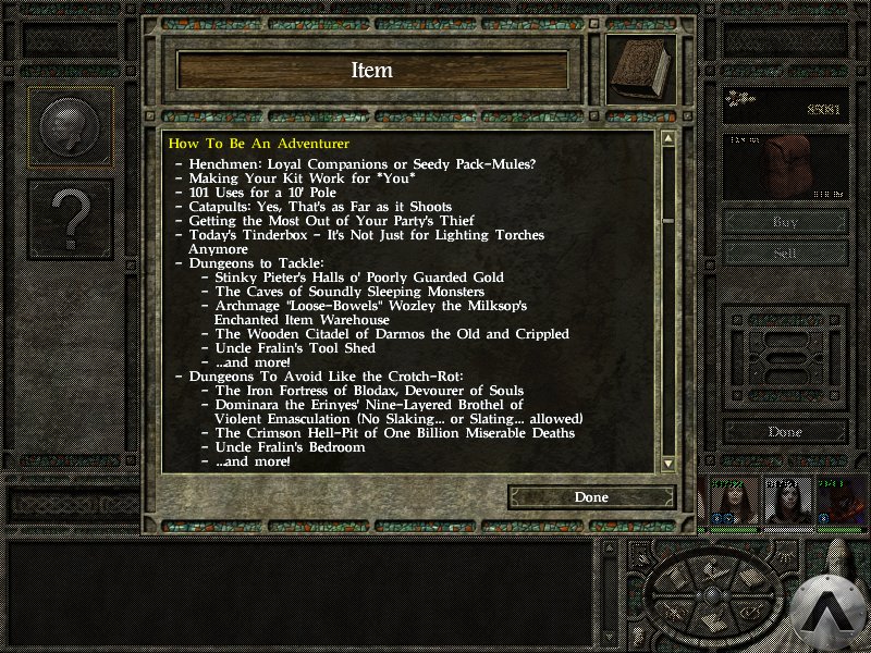 Sound FX: Nearly all of the voices have been ported directly from previous Infinity Engine titles; the only noteworthy addition is that of a male and female Drow, whose tongues drip venom and the occasional incontinent bursts of an Elvin dialect. While nearly all of the existing voices are functional, not much effort went into implementing them: a voice listed merely as a "male fighter" might have been tied to a Dwarf in a previous game, so when an Orc exclaims "When all else fails, put the Dwarf in charge," it just reeks of laziness. Monsters grunt and the undead chatter in the background, which is eerie, especially if one has the 3D environmental audio enabled. However, since the sound system treats each map as if it were a single panoramic region, rather than a collection of discrete audio environments, it does tend to give away enemy positions and take the wonder out of what\'s behind a closed door.