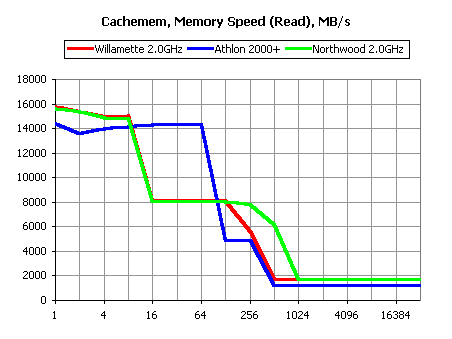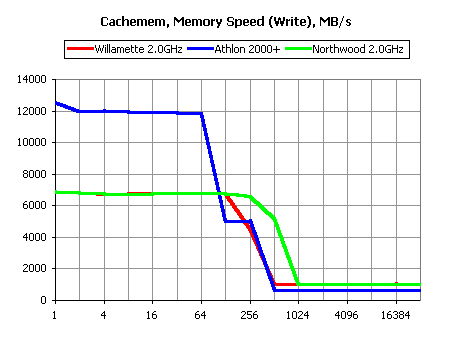 Both graphs, for the read and write speed, show clearly that the L2 cache of Northwood processor increased up to 512KB. Besides that, no other changes touched the memory subsystem performance. If you look at the first graph, for instance, you will be able to see that the part of the L1 cache intended for data remained unchanged and equals 8KB. Although we used to say that it is exactly the small L1 cache that limits the performance Pentium 4 CPU in many cases. For example, their competitors, Athlon XP processors, have 64KB L1 cache for data, which is 8 times bigger.