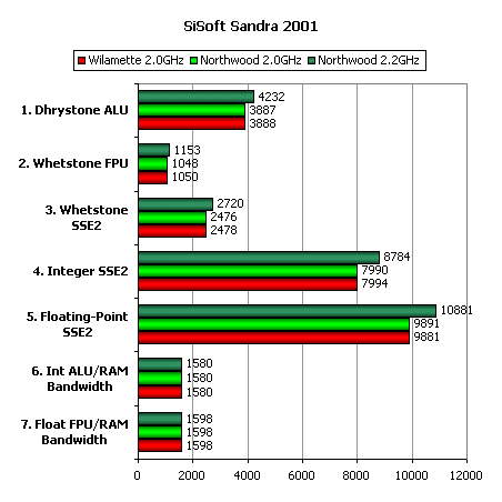 In order to prove that the new Northwood core doesn\'t have any other architectural improvements besides the increased L2 cache telling on the processor performance, we decided to run some synthetic benchmarks. We measured the performance of Pentium 4 2GHz on Willamette core and Pentium4 2GHz and 2.2GHz on Northwood core. For our tests we selected some benchmarks from SiSoft Sandra 2001 set. The algorithms used in this package to test different parts of the CPU are so simple that the results depend neither on the memory subsystem, nor on the processor cache size.