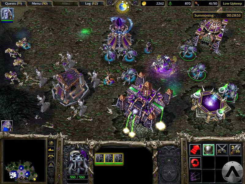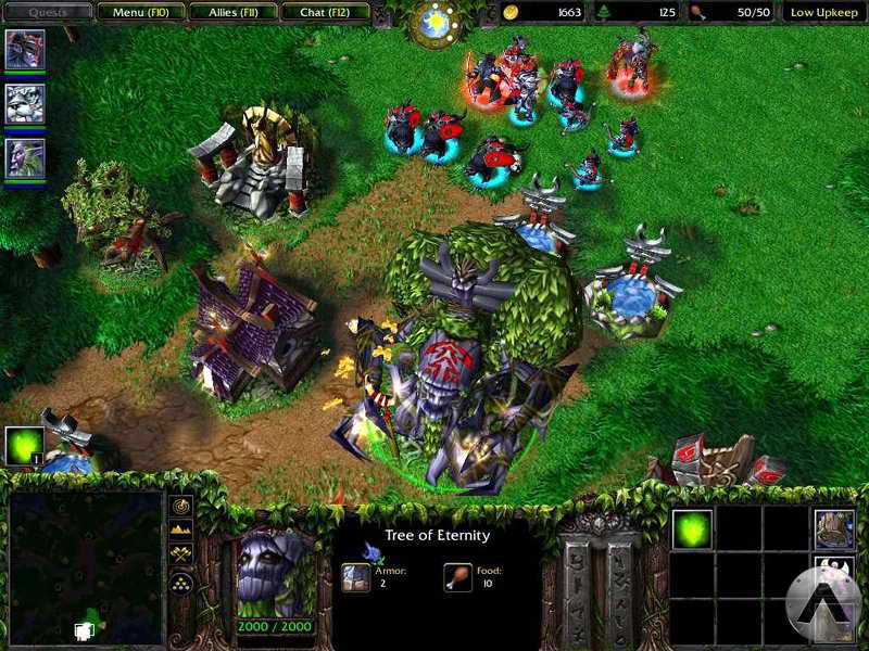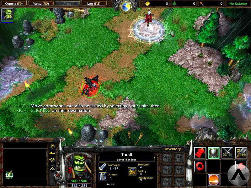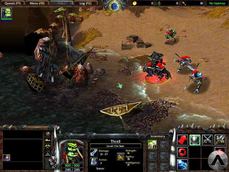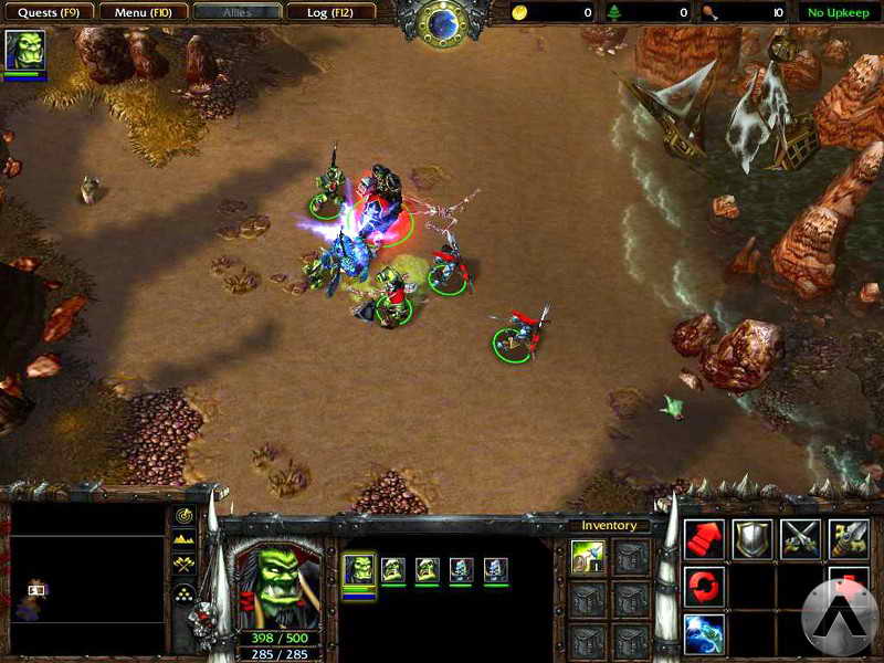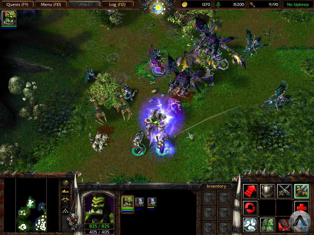 Viewing the action is just as intuitive as controlling it. Moving the mouse to the top edge of the screen scrolls the map in that direction, while rolling the mouse wheel up or down moves the game\'s default three-quarter angle perspective higher into the sky or more level with the ground. Although it\'s difficult to manage resources with the camera set nearly parallel to the ground, this view truly highlights the 3D action and brings the player closer to his or her units. The remaining screen real estate is nothing out of the ordinary; a thin bar running the length of the screen\'s top edge gives resource and upkeep information. The mini-map is entrenched in the lower left corner of the screen, showing explored areas and darkened, uncharted territory. The center of the bottom third\'s interface is the main status window, where a selected unit or group is displayed, along with the stats of those highlighted. Hero portraits are permanent fixtures of the screen\'s northwest corner, presenting health and mana bars as well as any available experience points. To the right of this centerpiece is the current hero\'s inventory, and WarCraft III\'s command center occupies the bottom right corner, where orders can be given to the hero and his troops.