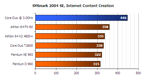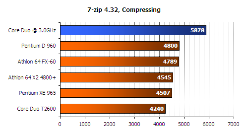 The performance of the overclocked Core Duo processor working at 3.0GHz is admirable. It is outpaces top dual-core processors from AMD and Intel, such as Athlon 64 FX-60 and Pentium Extreme Edition 965. And the performance advantage is more than tremendous in most tasks.