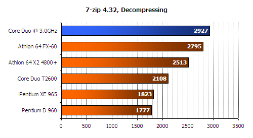 However, once we overclock it, the situation changes dramatically. At 40% higher clock speed Core Duo processor managed to improve its performance in encoding tasks by practically the same percentage. As a result, the 3GHz Intel Core Duo processor easily outperforms Athlon 64 FX-60 and Pentium XE 965.