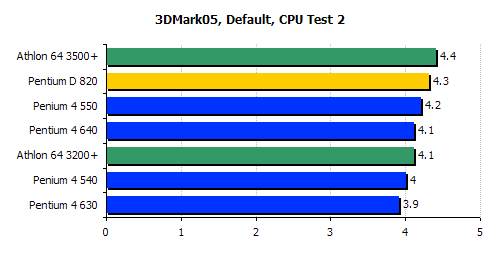 However, 3Dmark05 has two purely processor tests working in two threads: one of them emulates the shaders and another one calculates the physical environment model. In this case Pentium D 820 proves very impressive, yielding to Athlon 64 3500+ only once. Note that none of the Pentium 4 processors from the same price range can compete with Pentium D 820 here.