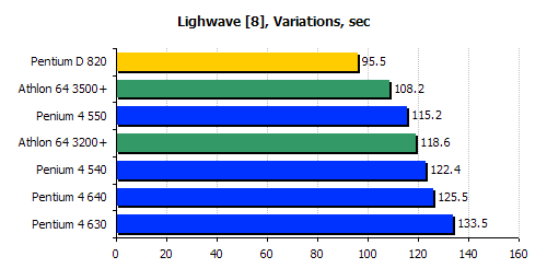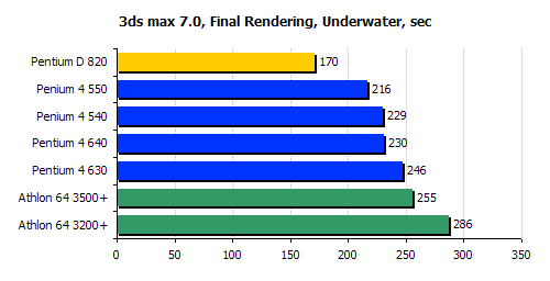 Pentium D 820 is an indisputable winner in 3D rendering tasks. No wonder: this type of algorithms can be easily split into a few parallel threads.