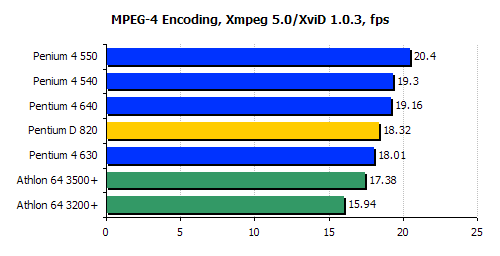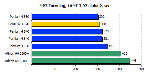 During audio and video encoding with different codecs, Pentium D 820 processor demonstrated pretty good results. It proved faster than Athlon 64 processors of the same price in all tests, and in LAME, Windows media Encoder and DivX it also outperformed single-core Pentium 4 CPUs.